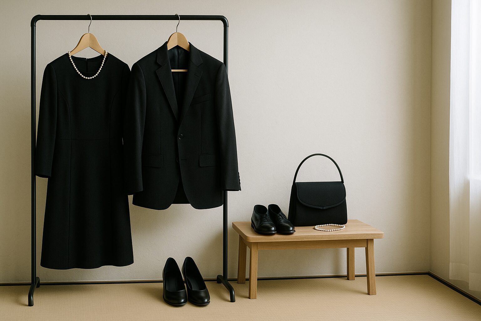 - 平服は普段着ではなく略喪服やフォーマル寄りが原則。黒〜濃紺の控えめな装いに小物も黒で統一。