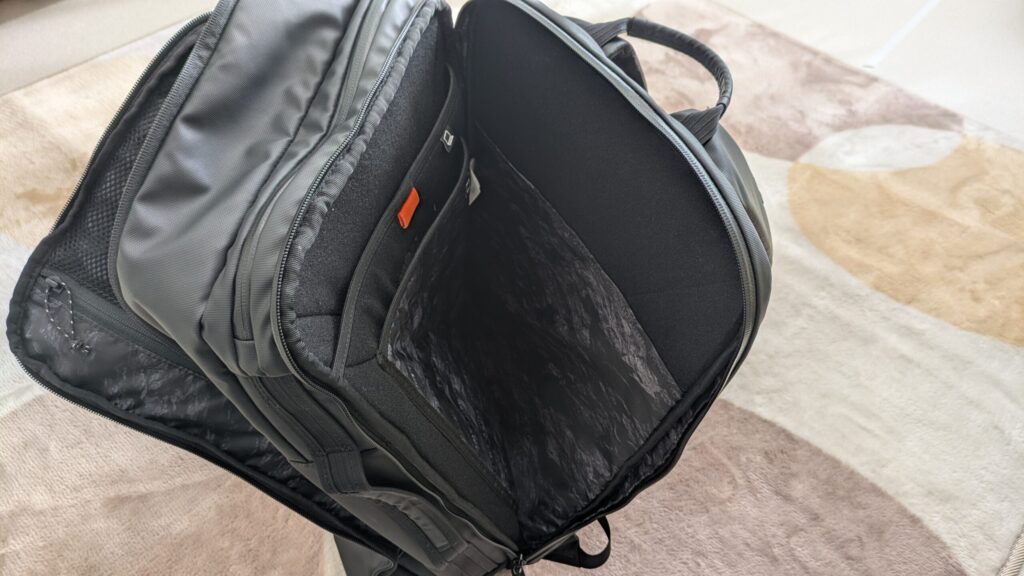 ビジネスでも使える見た目で、容量は25L。僕の感覚では、前回レビューしたグレゴリーの通勤リュックより一回り大きくて、作りもしっかりしています。